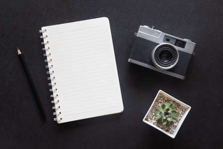 Top view of dark concept office desk with camera, decorations and copy space on black table