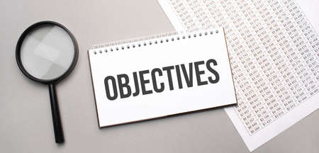 OBJECTIVES sign in white paper notepad and magnifying glass on the gray background