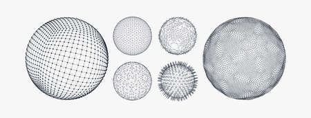 3D sphere mesh. Globe shapes with dots and line grid, orb wire structure models matrix futuristic concept. Digital polygonal balls with particles vector set. Physic abstract surfaces