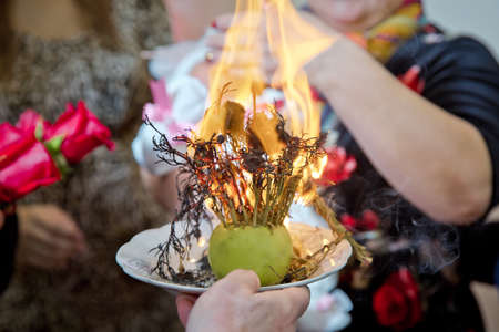 Orthodox Church. Christianity. Hand of priest lighting burning candles in traditional Orthodox Church on Easter Eve or Christmas. religion faith pray symbol
