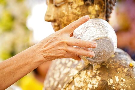 water pouring to Buddha statue in Songkran festival tradition of thailand