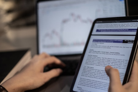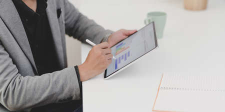 Young professional businessman working on his upcoming project with charts and graphs on tablet