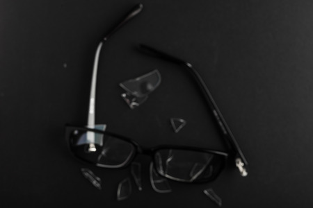 Broken black eyeglasses over black background. Blurred image
