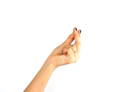 Female show two hands with crossing fingers for hope, isolated on white background with free space for text