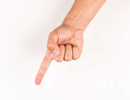 Close-up of male hand showing direction with finger on white background.