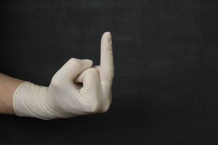 A hand in a white medical disposable rubber latex glove shows the middle finger on a black background, Fuck you. Protective disposable gloves protect against viruses, coronavirus, dangerous bacteria.