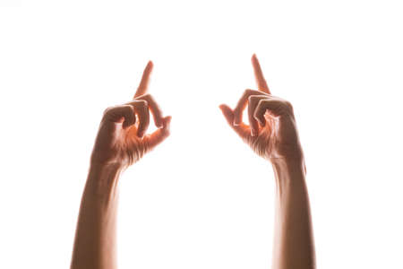 Hand gestures. Elegant female hands point upward, isolated on white, contour lighting, contrast.