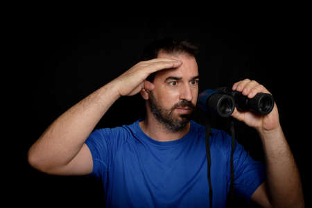 Bearded man dressed in blue t-shirt with binoculars posing against black background. Fashion concept
