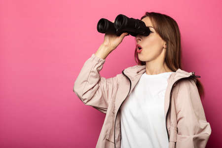 Young woman looking in surprise through binoculars on pink background