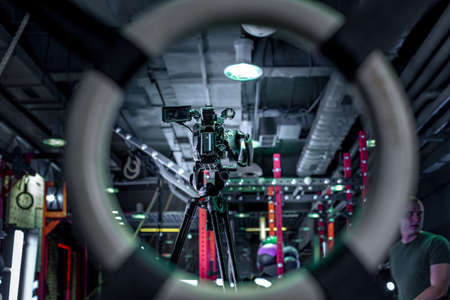 The interior of a large modern video studio with professional equipment prepared for work. Camera in the foreground
