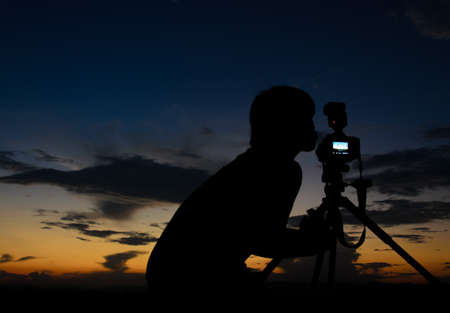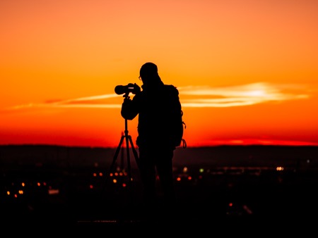 Image of a silhouette of a man with tripot and camera standing on a hill during colorful sunset