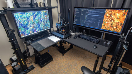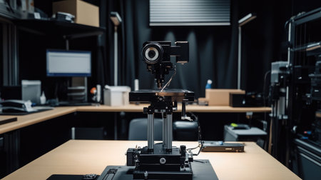 A high-tech camera setup displayed on a precision table in a modern workspace, surrounded by various technology equipment, showcasing a professional photography environment.