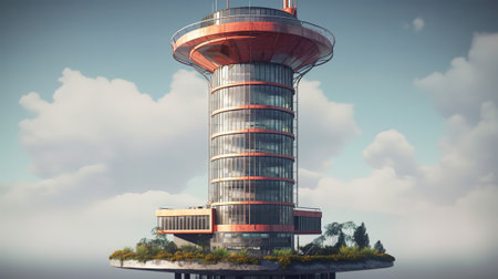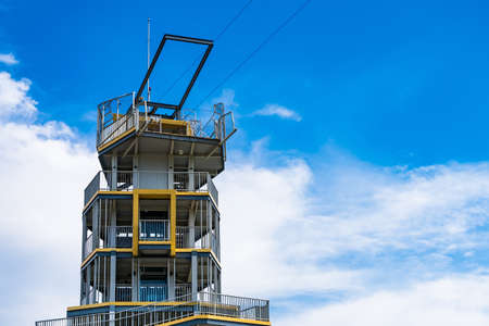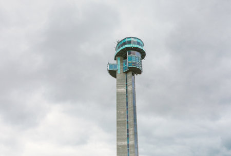 Modern air traffic control tower against a cloudy sky. Tower observation decks offer a panoramic view of the surrounding airport area