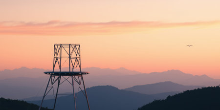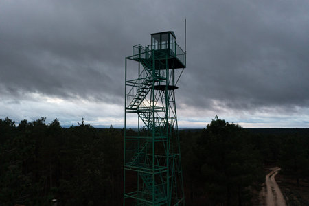 Aerial view fire watch tower in agriculture field. Fire safety and travel concepts.
