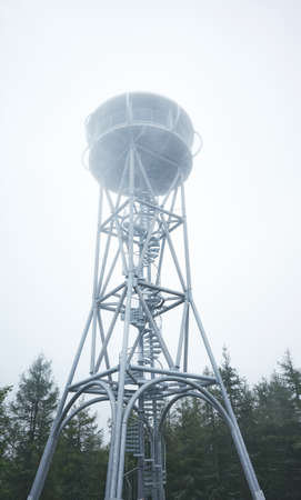 A signal tower surrounded by mist, with lights piercing through the fog.