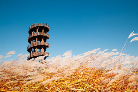 Observatory tower and dry reed field. Autumn of Gaetgol Eco Park in Siheung, Korea