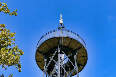 The Slovanka Iron Lookout Tower rises against a clear blue sky in the Jizera Mountains, providing panoramic views of the surrounding landscape and inviting visitors to explore.