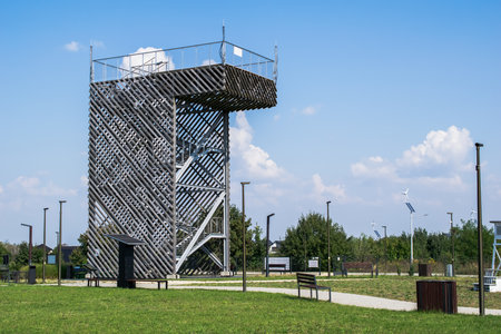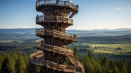 Salas, Czech Republic - April 17, 2022 - A completely unconventional tourist lookout tower above the village of Sala in the foothills of the Chriby Mountains.
