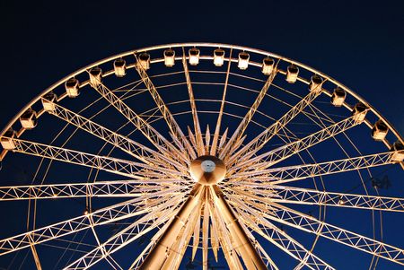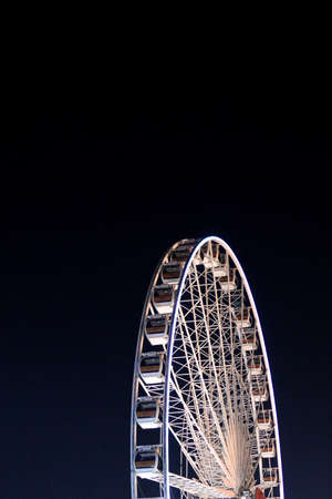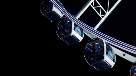 Close up some part of Ferris Wheel at evening time. Big observation wheel on the dark blue sky background. Holiday concept.