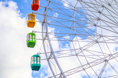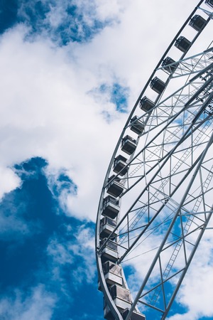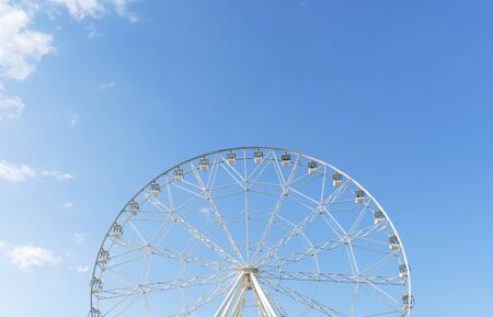 Closeup modern Ferris wheel against blue sky and white clouds. Ferris wheel at funfair for entertainment and recreation on holiday. Modern construction of Ferris wheel in amusement. Fun festival.