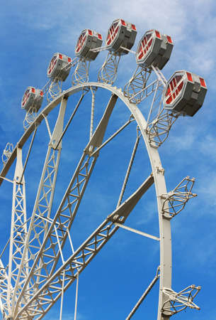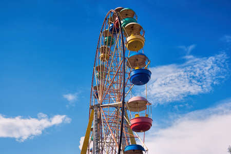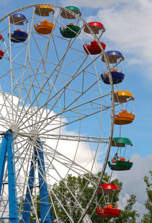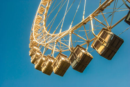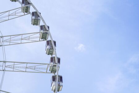 Cabins the ferris wheel against the blue sky. Summer fun at the amusement Park.