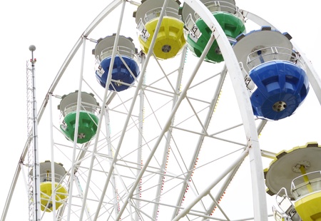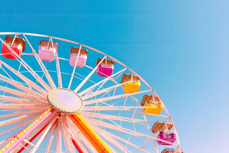 Colorful Ferris Wheel in the amusement park. Ferris Wheel with blue background. Funfair.