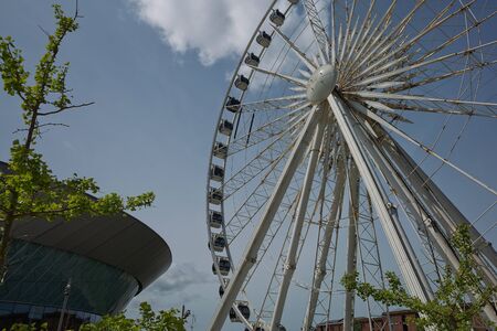 LIVERPOOL, ENGLAND, UK - JUNE 07, 2017: View of the ECHO convention center and an adjacent ferris wheel in Liverpool, England