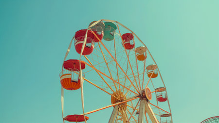 Retro brightly colored ferris wheel is silhouetted against a vibrant blue sky on a sunny day, with white clouds on background. Generative AI