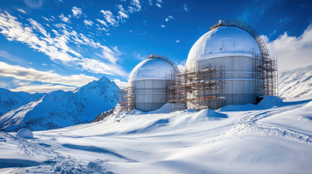 A breathtaking winter scene featuring observatory domes surrounded by snow-covered mountains under a vibrant blue sky, showcasing nature's beauty.