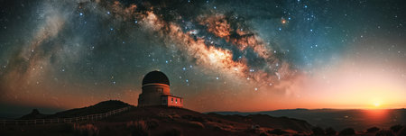 A breathtaking view of a mountain observatory under a starry night sky showcasing the Milky Way. This image captures the beauty of the cosmos and tranquility of nature.