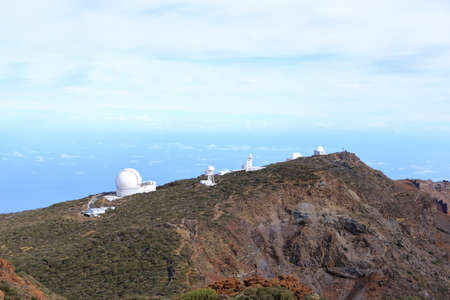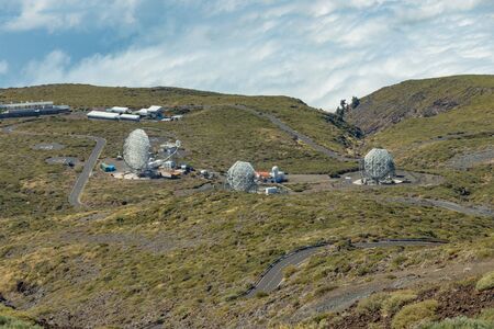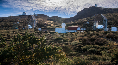 View on international space observatory and telescopes on La Palma island located on highest mountain range Roque de los muchachos, sunny day, Canary islands, Spain