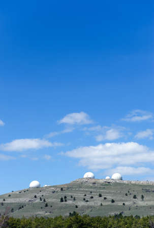 Army or radar stations on the top of the crimean high mountain plain. Radar domes are seen rising above the green plains on Ay Petri mountain.