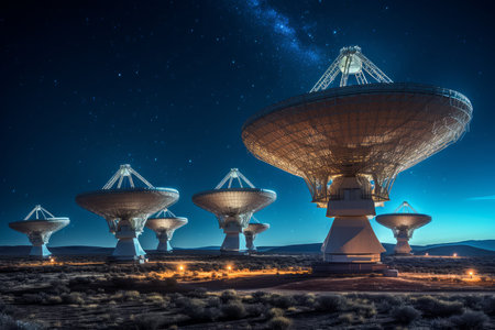 Radio telescopes against a backdrop of the Milky Way galaxy, highlighting exploration and technology.