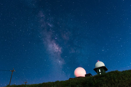 White meteorological radar station with blinking lights set against a deep blue starry sky and a romantic galaxy. Captivating night scene, Wufeng Mountain, Taiwan.