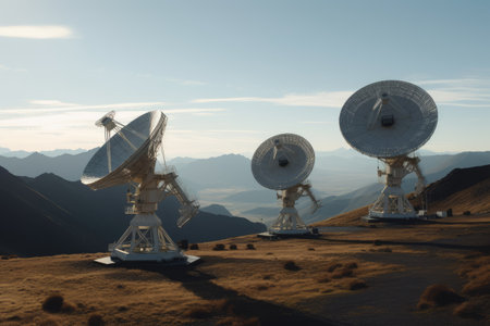 A photograph of a radio telescope array on a remote mountaintop, with multiple dishes pointing towards the sky and capturing data from distant celestial objects. Generative AI