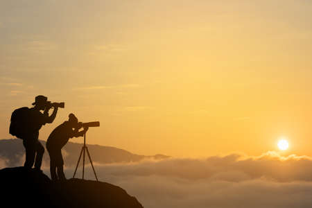 Silhouettes of hikers with backpacks enjoying sunset view from top of a mountain, Silhouette tourists and photographers with beautiful sunrise