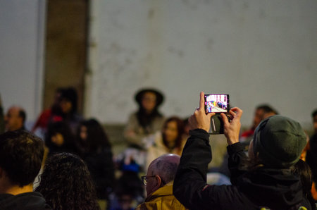 A group of people attending an outdoor event at night, with a person in the foreground recording the moment using a smartphone. The scene conveys urban lifestyle and spontaneous emotions.