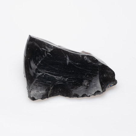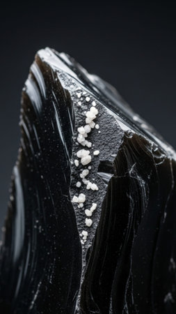 Premium digital artwork showcasing intricate glossy textures, sharp multifaceted edges, and enigmatic lighting in deep raven tones for a mysterious ancient vibe. Perfect for commercial applications in archaeology visuals, fantasy game assets, historical media, jewelry mockups, and collectible designs. Targets creative professionals, educators, and marketers w... AI-generated digital illustration. AI-generated illustration.
