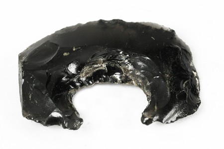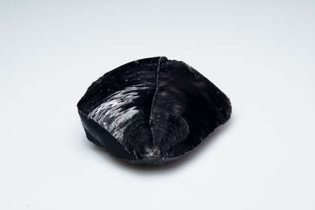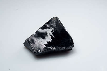 Black Obsidian, black and crystalline ore on isolated white background. Black colored stone, therapeutic, used in meditation.
