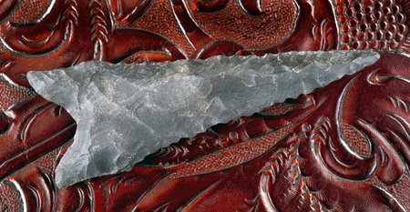 A detailed image of an ancient stone arrowhead, showcasing natural wear and tear, likely crafted by early humans for hunting and survival.