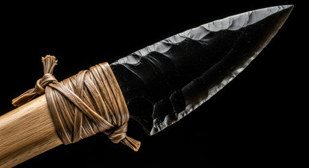 Primitive obsidian arrowhead with wooden shaft and leather binding on black background