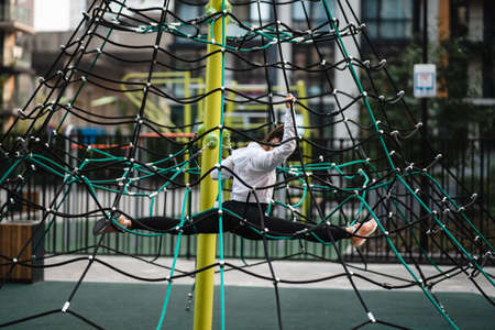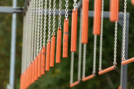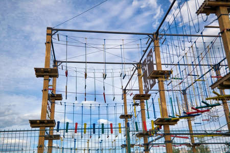 The bridges, ropes and ladders of the Adventure Park are designed for beginners among the tall trees. Adventure climbing in a high rope course. Rope track in the city park