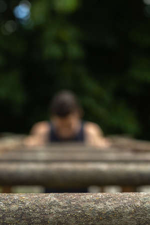 selective focus of a young man performing calisthenics exercises on wooden bars with handstand and crunches.