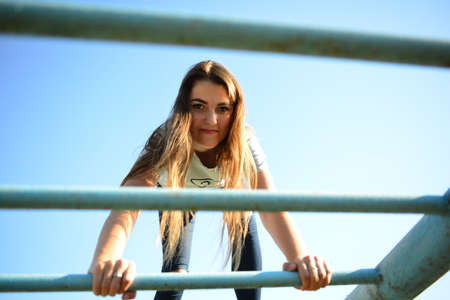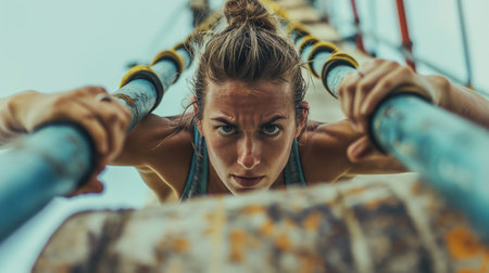 Woman gripping red rope net on wooden posts, preparing to climb wooded obstacle course, copy space. Adventure, fitness, outdoor, challenge, determination, strength, stamina