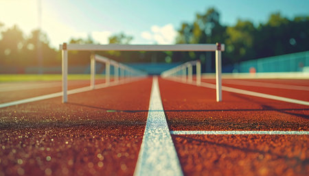 A row of hurdles stands ready on a vibrant red running track, bathed in the warm glow of the sun.