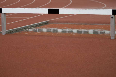 A hurdle placed in the middle of a red running track, waiting for a perfect leap.