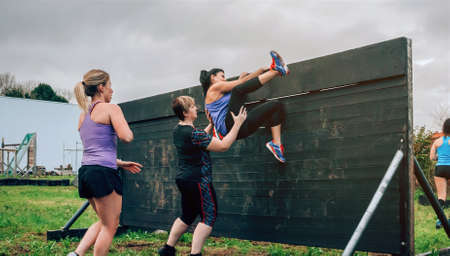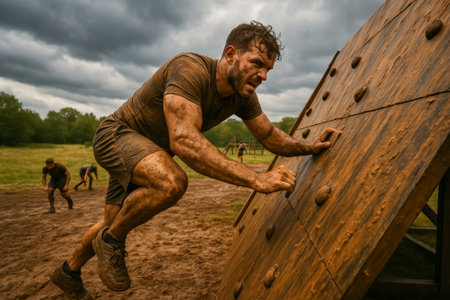 A determined man covered in mud climbs a wooden wall during an obstacle course challenge