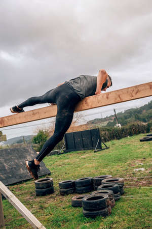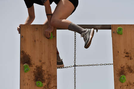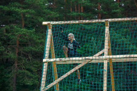 Poznan, Poland - June 2021: An hard extreme obstacle course Survival Race at rainy day