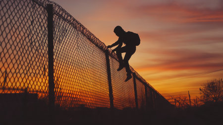 A young individual is scaling a chain-link fence during sunset in an urban setting. The vibrant colors of the sky create a striking backdrop to this adventurous act