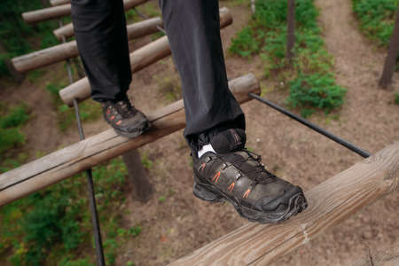 Rope park. A woman in trekking shoes runs a route in a rope park. Close-up of legs